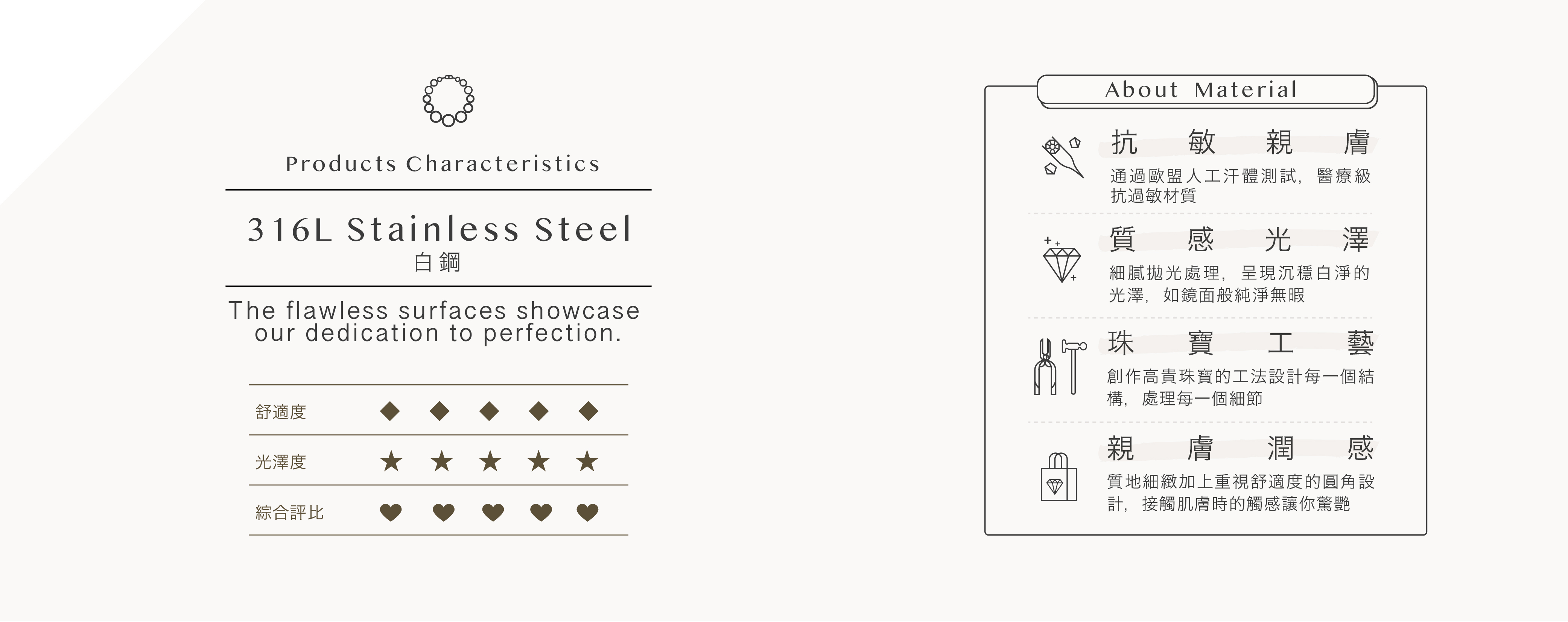 316L白鋼為抗過敏材質,是應用於植入體內的醫療器材的抗過敏材質。防水且耐日常腐蝕,戴著洗澡也沒問題。